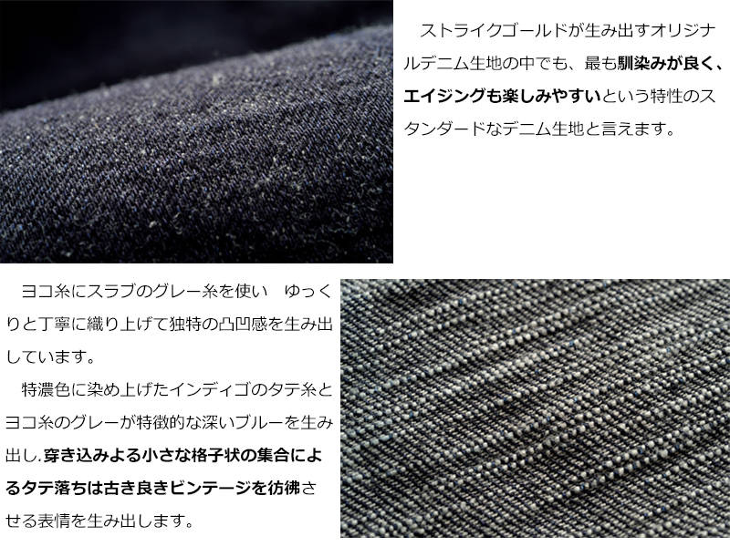 The Strike Goldのジーンズは、厳選されたコットンを使用し、旧式のシャトル織機や熟練職人の縫製技術によって作られます。穿くほどに個性が表れ、美しいエイジングを楽しめる一着です。
