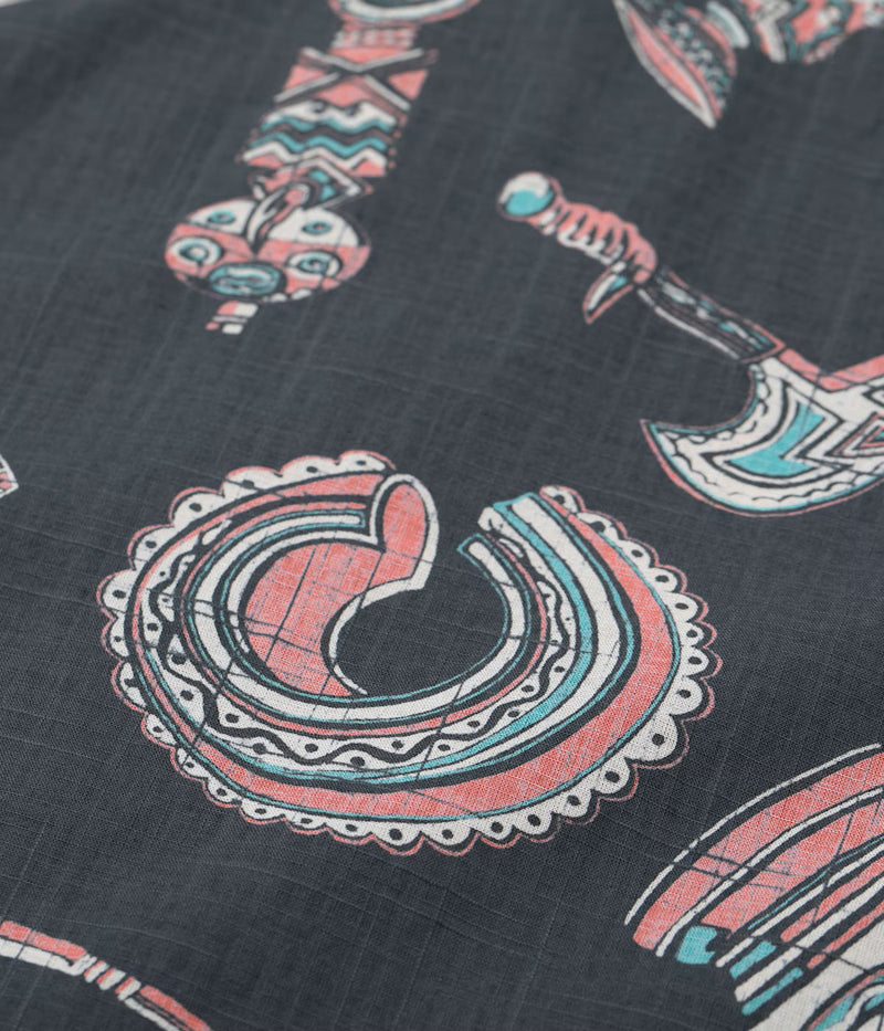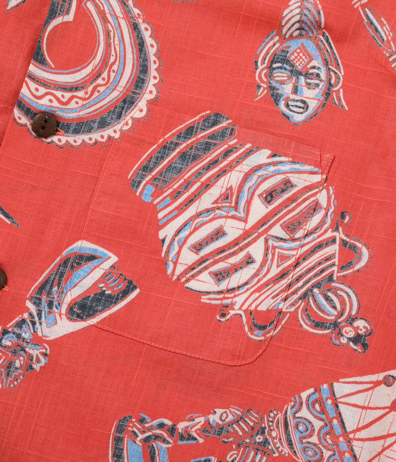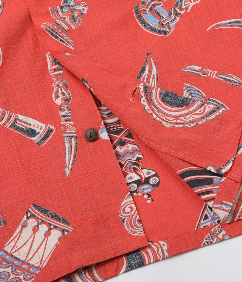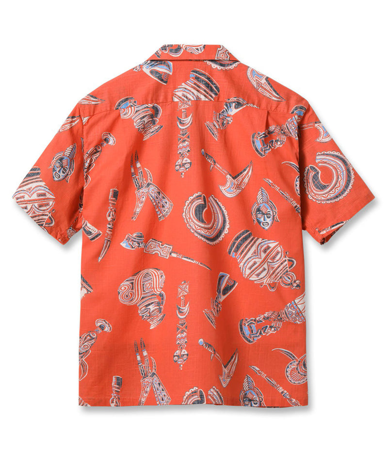 高温多湿な日本の気候に最適なコットンリネン(綿麻の混合)生地をベースとして、レーヨンに勝るとも劣らないプリントの発色が魅力の一枚。ヴィンテージアロハシャツのデザインとプリント手法を再現し、古くから伝わるお面や武器、装飾品を鮮やかに描き出している。また、生地を裏使いすることで上品に仕上げ、こだわりを詰め込んだ作品。