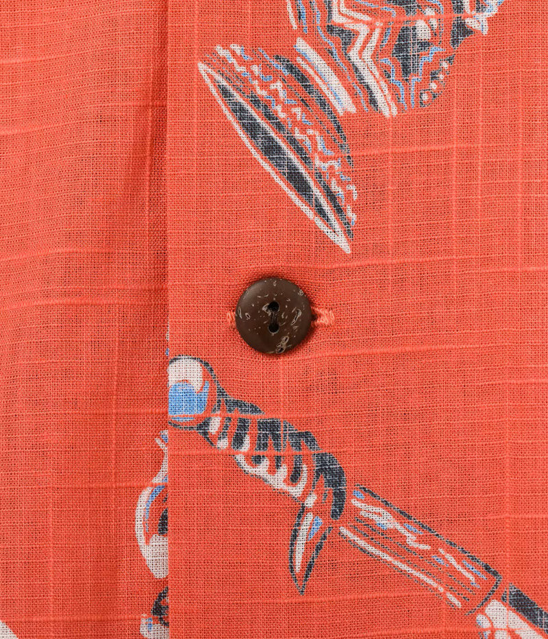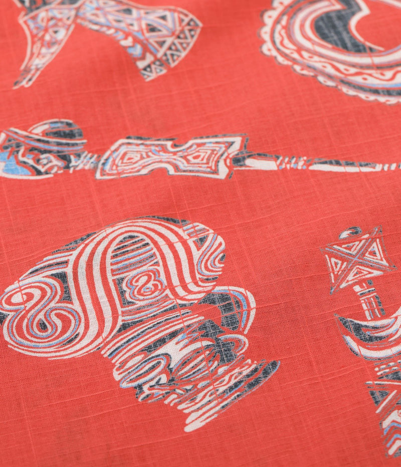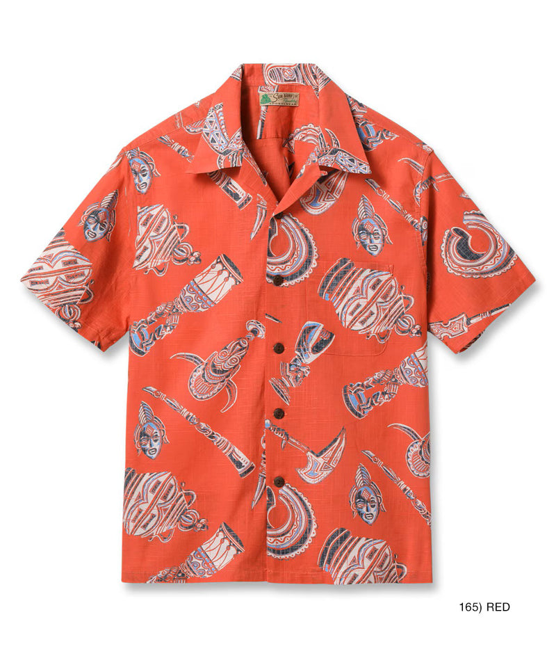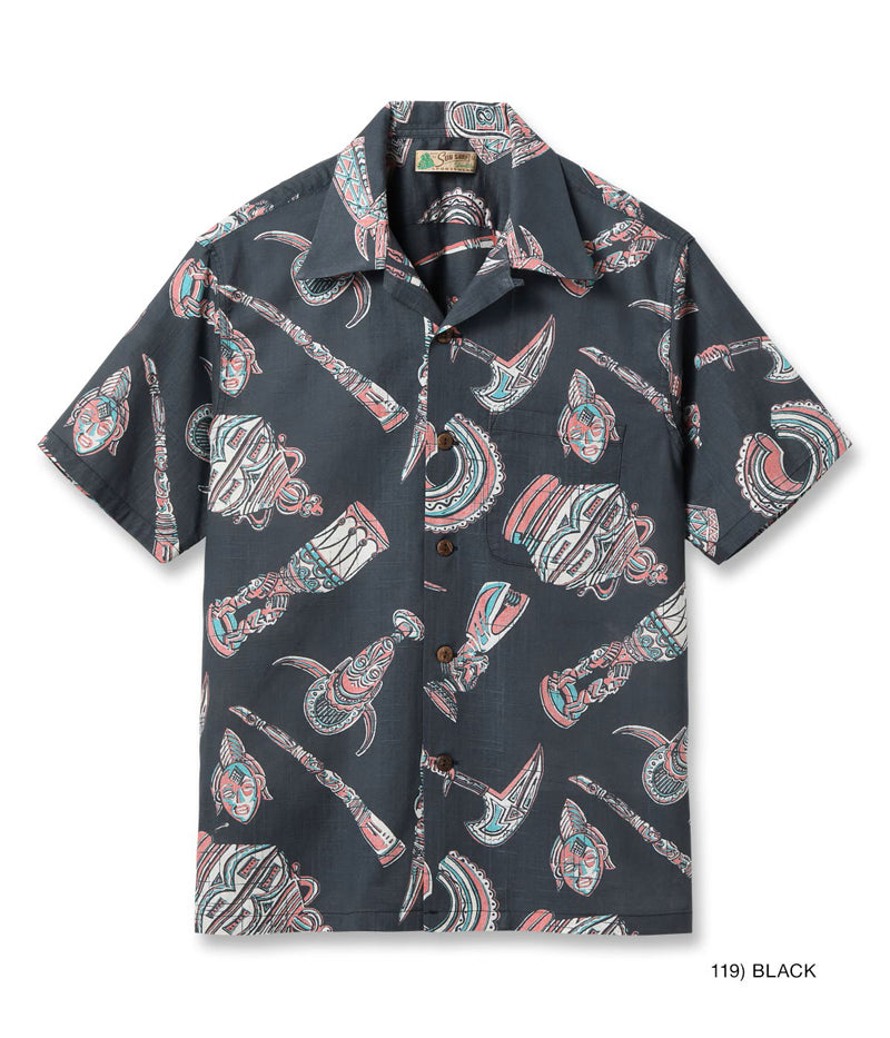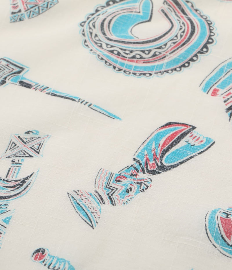 高温多湿な日本の気候に最適なコットンリネン(綿麻の混合)生地をベースとして、レーヨンに勝るとも劣らないプリントの発色が魅力の一枚。ヴィンテージアロハシャツのデザインとプリント手法を再現し、古くから伝わるお面や武器、装飾品を鮮やかに描き出している。また、生地を裏使いすることで上品に仕上げ、こだわりを詰め込んだ作品。
