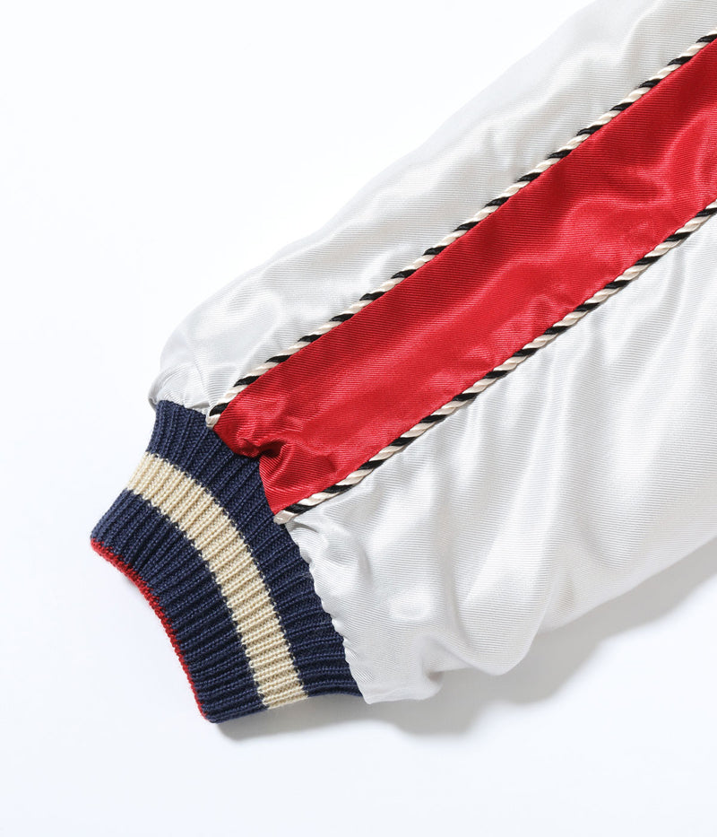 富士山、五重塔、鳥居など日本の美しい風景が凝縮されたジャパンマップ柄。1950 年代初期のヴィンテージを再現したもので、無地場が少なく背中全面が刺繍で埋め尽くされた豪華な仕様が特徴。グリーン×オフホワイトのボディに対し、関連性のない赤いリブを配してアクセントとしているのもこの時代のスカジャンならでは。