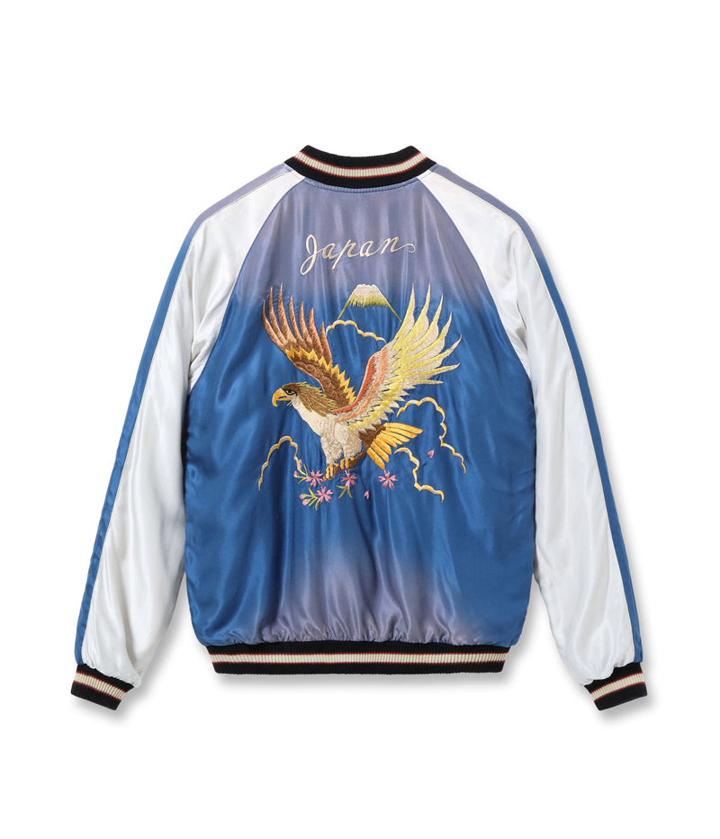 リバーシブル面は桜の木から飛び立とうとする鷲の絵柄。大きく広げた翼を描写するため多色の刺繍糸を使い、翼の外側は濃色、内側は淡色のグラデーションで表現している。褪色したブルーのボディに映える桜の花も印象的な作品。
