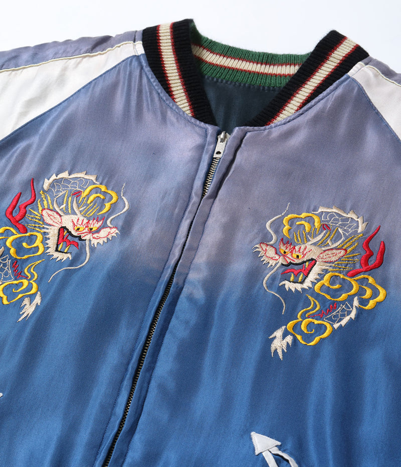 アセテートから色の分子が抜け、程よく光沢が抑えられた深みのある生地感。風合いを増したリブの質感。刺繍に用いられるレーヨン糸の褪色。これらのスカジャンの経年変化の魅力を再現し、購入時からヴィンテージさながらの風合いを楽しむことができるのがテーラー東洋のエイジングモデル。