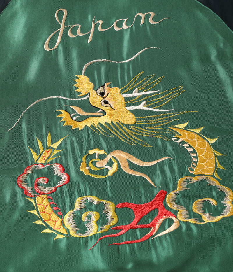 リバーシブル面は、身頃より袖下の色の方が濃い「逆配色」。グリーン×ブラックのダークトーンのボディには、金龍に使われているイエローや淡いピンクの色糸が映える。