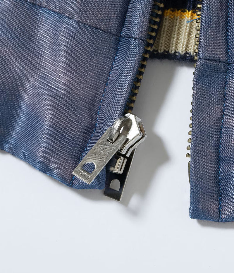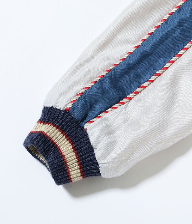 富士山を挟んで鷲と龍が睨み合う、1950年代初期の壮大なスケールの作品。ブルー×シルバーのボディにリブの赤いラインやパイピングの赤がアクセントとなり、トリコロールを意識した配色に仕上がっている。絵柄の上部にJAPANの文字が無いためジャケットの背中を広く使い、鷲と龍という2つのモチーフでもデフォルメせず緻密に刺繍されているのが特徴。また、富士山にはビビッドな発色の色糸を使っており、エイジング加工によって光沢感が落ち着いたマットなブルーのサテン生地に対してさらに鮮やかなブルーのコントラストが際立つ。